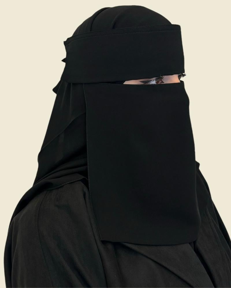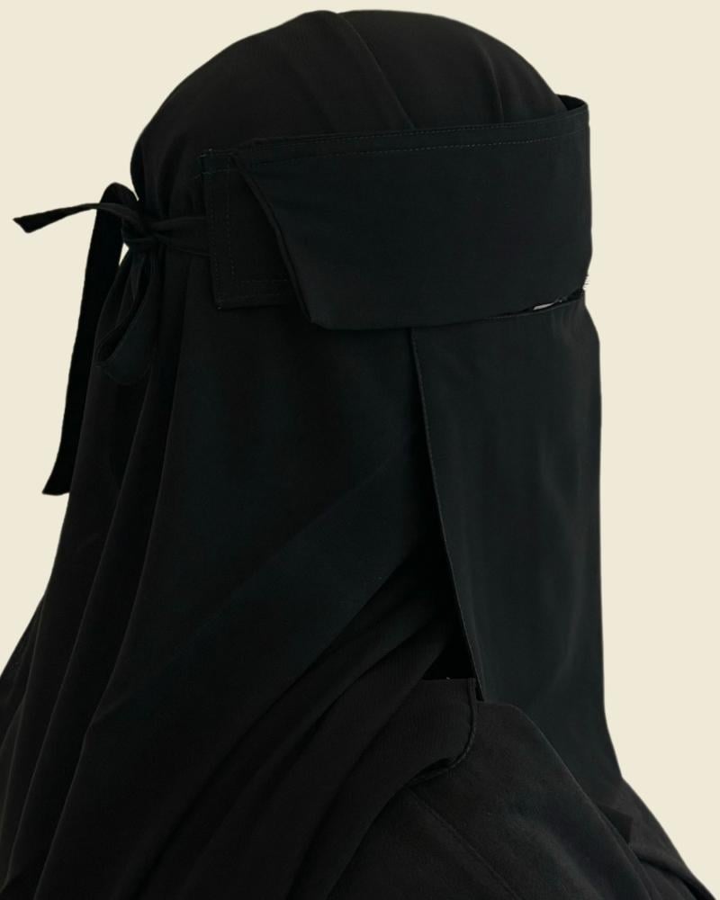 نقاب طويل ملكي أنيق، تصميم فاخر بربط خلفي لتثبيت مريح وآمن. خامة قماش خفيفة وناعمة تمنحك تغطية كاملة مع راحة في اللبس طوال اليوم. مثالي للمناسبات والاستخدام اليومي، ويتميز بلون أسود فخم يحافظ على أناقتك.