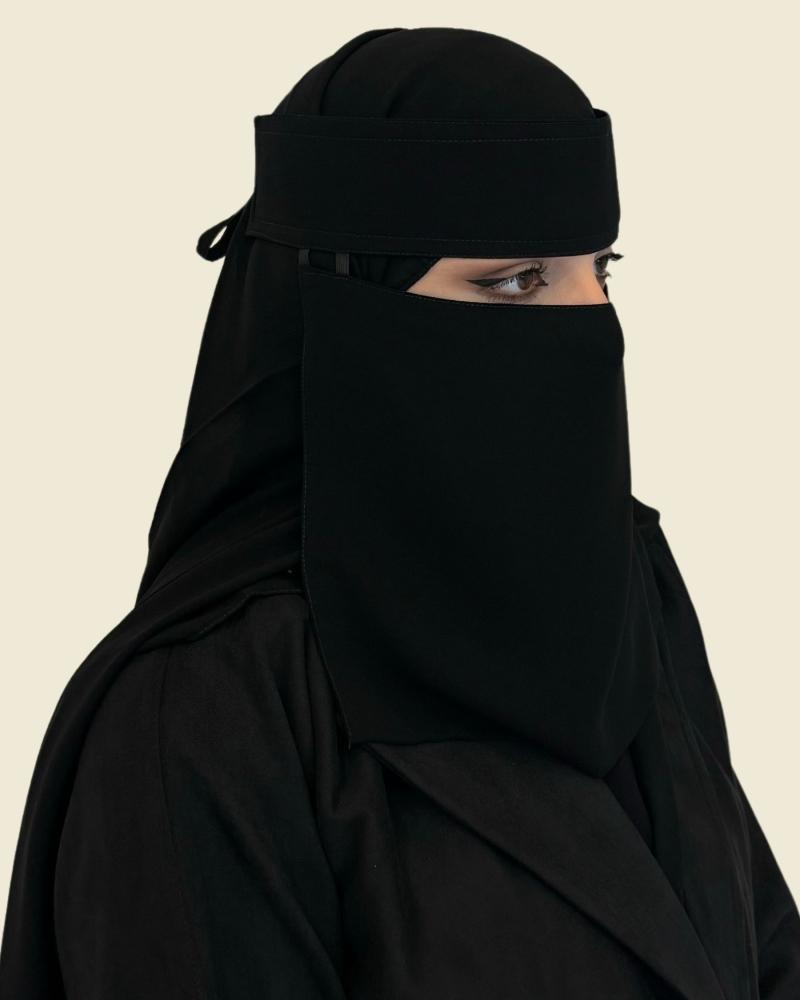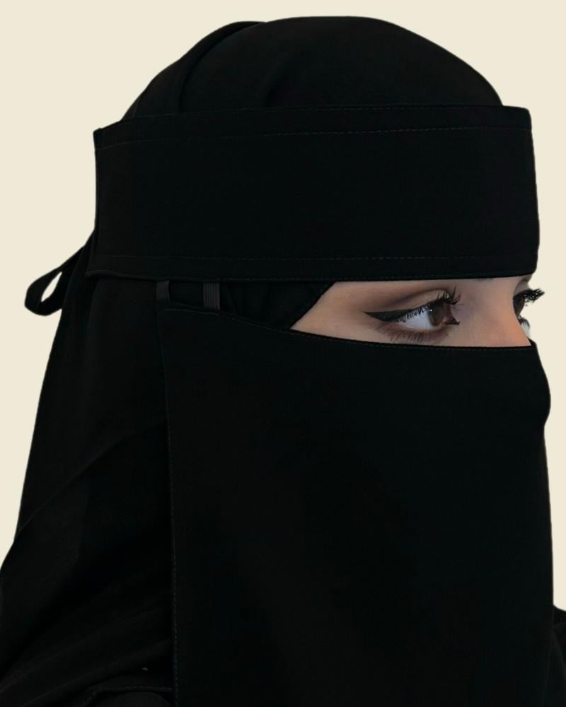 نقاب طويل عملي بخامة عالية الجودة، مزود بمطاطين (مغاطين) لثبات مثالي، مع ربط خلفي لراحة أكبر. يمنحك تغطية كاملة وشكل أنيق، مناسب للارتداء اليومي والسفر والمشاوير الطويلة.