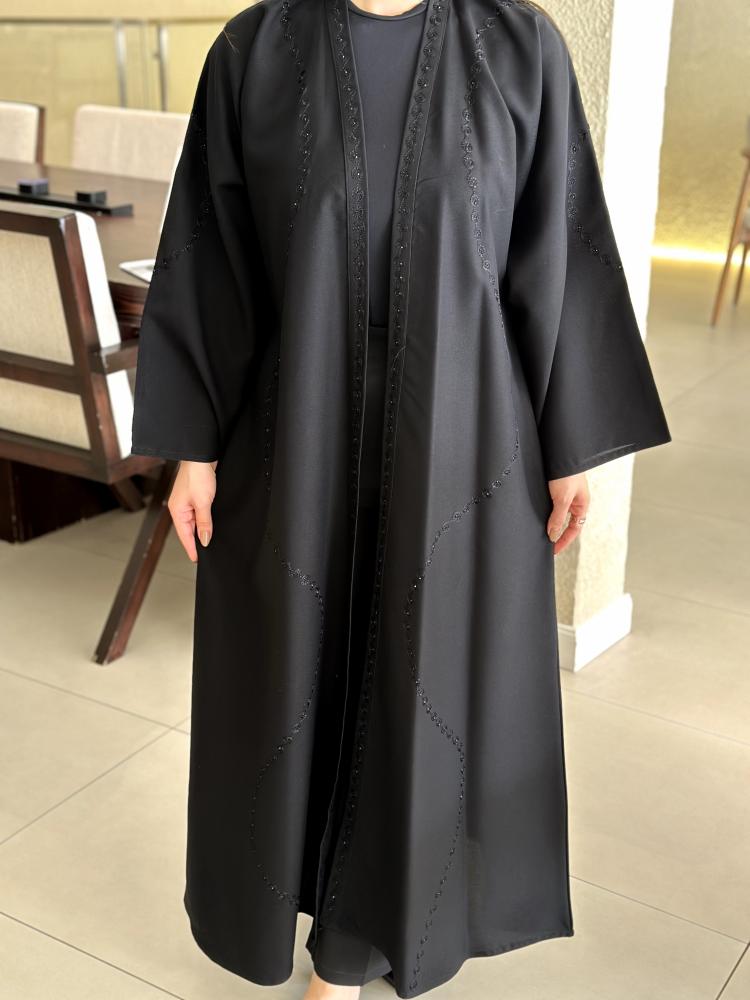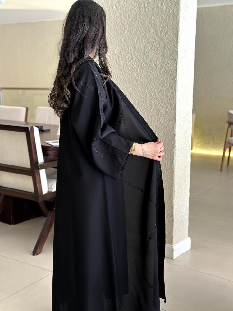 تتميز العباية بلونها الأسود العميق الذي يضفي لمسة من الرقي، مع تفاصيل دقيقة من الكريستال اللامع التي تضيف لمسة من التألق. القماش الكتان المستخدم في صنع العباية يوفر ملمسًا ناعمًا ومريحًا، مما يجعلها مثالية للاستخدام اليومي أو في المناسبات الخاصة.